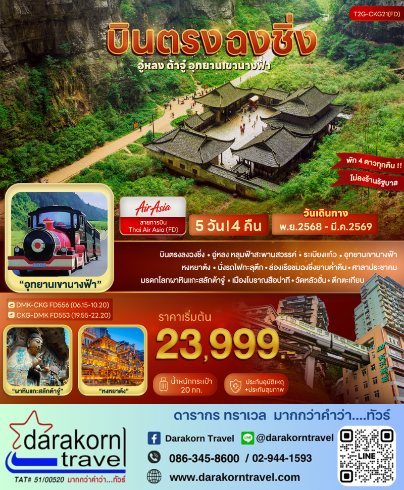 | DAY1 | สนามบินดอนเมือง DMK-CKG FD552 (14.45-18.50) สนามบินฉงชิ่ง – ทานมื้อเย็น – เข้าโรงแรม |