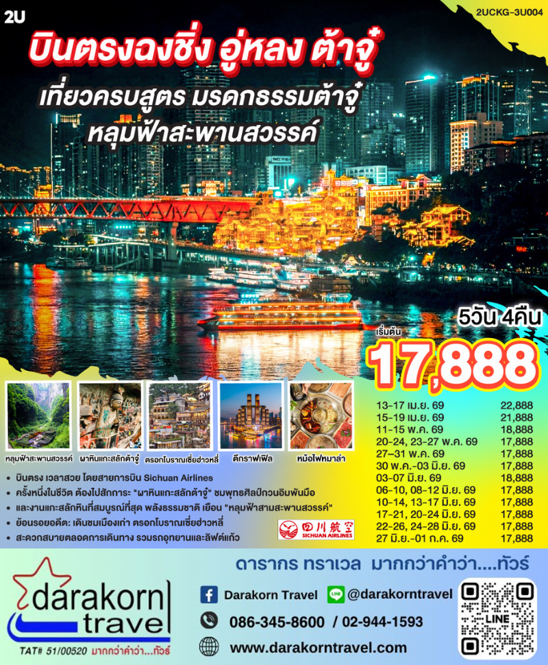 | DAY1 | กรุงเทพฯ (สุวรรณภูมิ) – ฉงชิ่ง (สนามบินฉงชิ่งเจียงเป่ย) (3U3772: 19.20-23.50) |