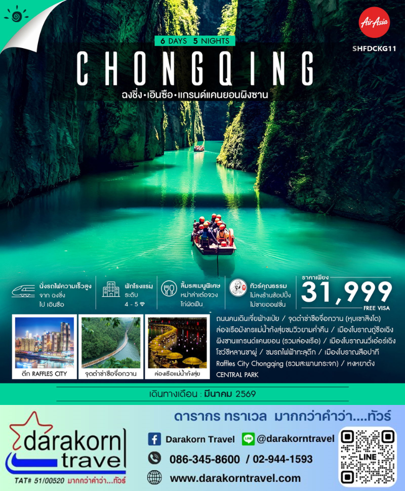 | DAY1 | กรุงเทพฯ (สนามบินดอนเมือง) • ฉงชิ่ง (FD556: 06.15–10.20) • CENTRAL PARK • ถนนคนเดินเจี่ยฟ่างเป่ย |
