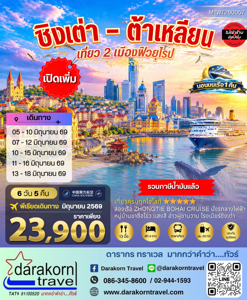 | DAY3 | เมืองชิงเต่า-หมู่บ้านประมงซาจื่อโข่ว-เมืองเวยไห่-สวนสาธารณะเวยไห่-กรอบรูปยักษ์วิวทะเล-ถนนคบเพลิงหมายเลข 8 – เมืองเยียนไถ-ปลาวาฬเกยตื้น-ท่าเรือประมงไห่ชาง-ขึ้นเรือเพื่อเดินทางสู่เมืองต้าเหลียน (นอนค้างคืนบนเรือ) |