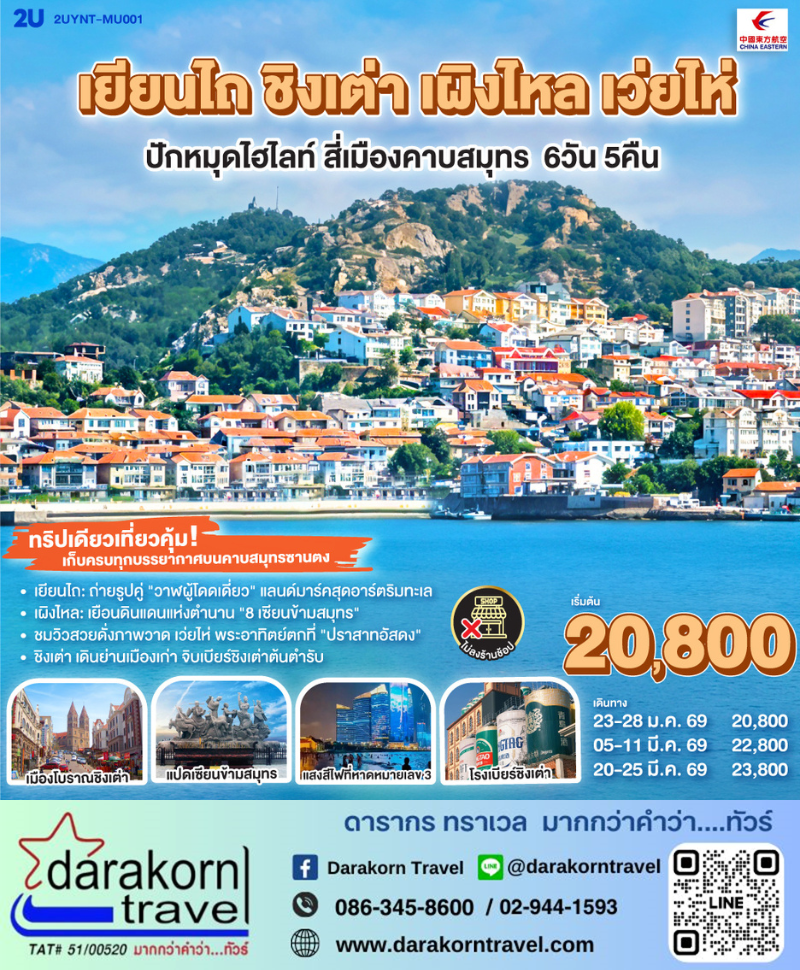 | DAY6 | ถนนปาต้ากวน – ชมวิวเขาซิ่นฮ่าวซาน – ชิงเต่า (สนามบินชิงเต่าเจียวตง) – คุนหมิง (สนามบินคุนหมิงฉางสุ่ย) (FM9416 : 15:55 – 19:45) – กรุงเทพฯ (สนามบินสุวรรณภูมิ) (MU893: 23:35 – 01:15+1) |
