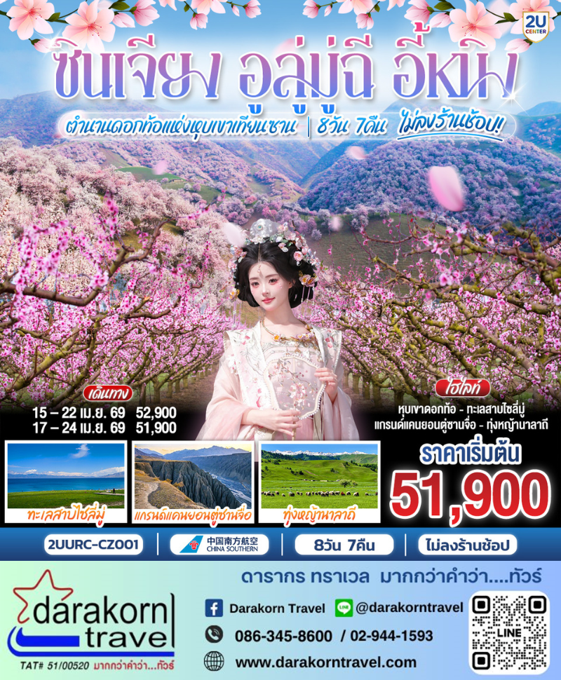 | DAY1 | กรุงเทพฯ(สนามบินสุวรรณภูมิ) – กวางเจา (สนามบินไป๋หยุน) (CZ362 : 08.20-12.10) – อูลู่มู่ฉี (สนามบินเทียนซาน) (CZ6892 : 15.15-20.50) |