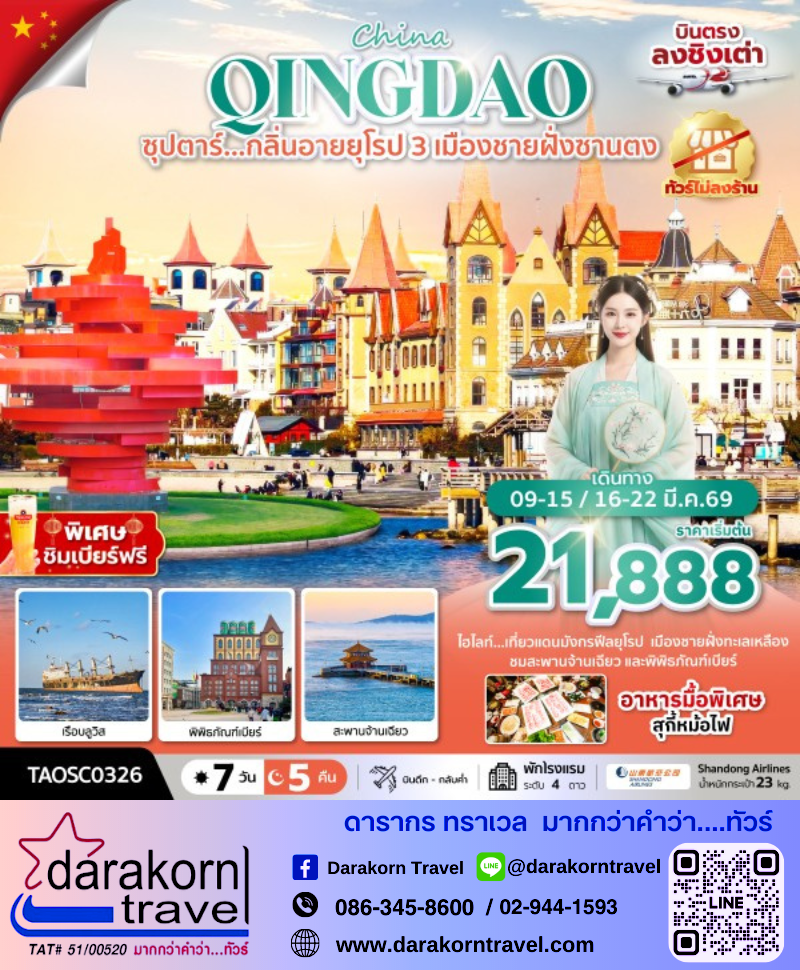 | DAY4 | เมืองชิงเต่า – หมู่บ้านชาวประมงซาจื่อโขว่ – พิพิธภัณฑ์เบียร์ชิงเต่า (ชิมเบียร์ฟรี 1 แก้ว) – ถนนคนเดินไท่ตง |