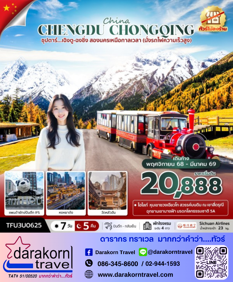 ทัวร์จีน - ซุปตาร์…เฉิงตู-ฉงชิ่ง สองนครเหนือกาลเวลา 7วัน5คืน(3U)เดือนพฤศจิกายน 2568 - มีนาคม 2569