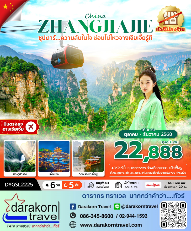 | DAY4 | ถ้ำมังกรเหลือง – อุทยานจางเจียเจี้ย + เขาอวตาร + ขึ้นลิฟท์แก้ว – สะพานหนึ่งในใด้หล้า |