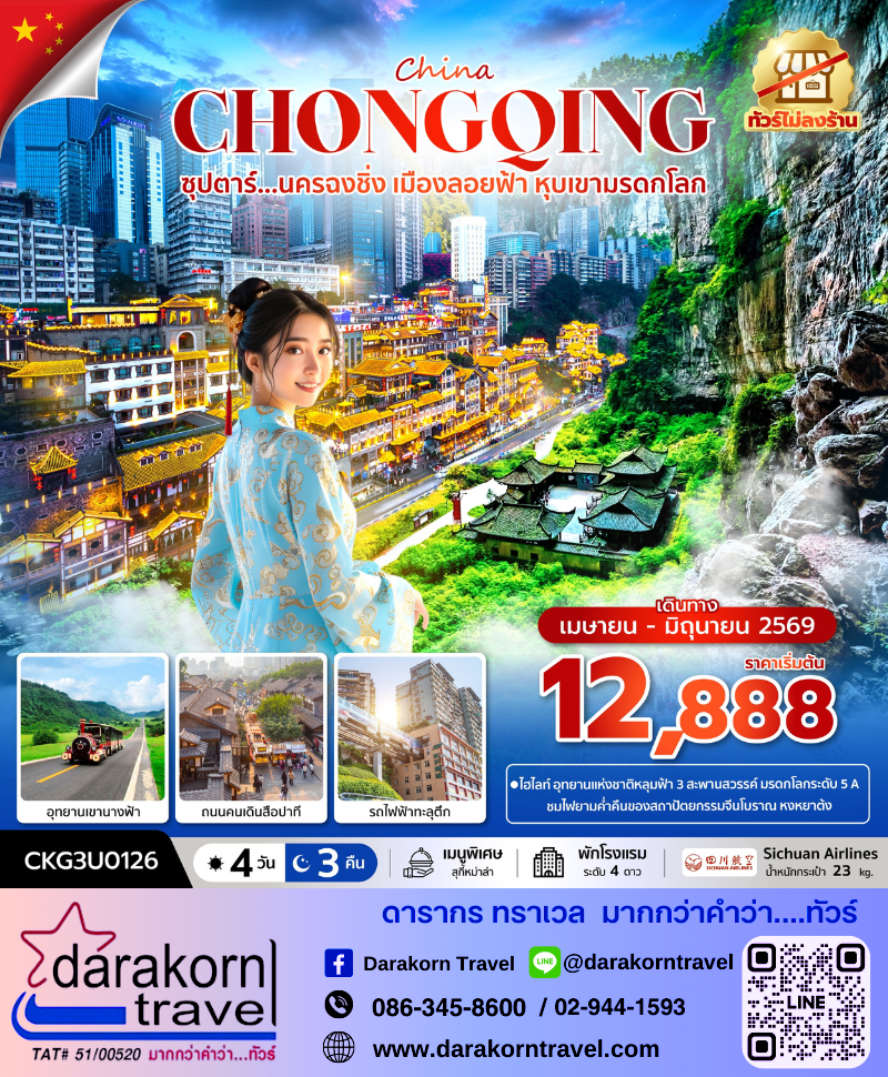 | DAY1 | สนามบินนานาชาติสุวรรณภูมิ (กรุงเทพฯ) 3U3772 (BKK – CKG 19.20 น.-23.50 น.)สนามบินนานาชาติฉงชิ่งเจียงเป่ย |