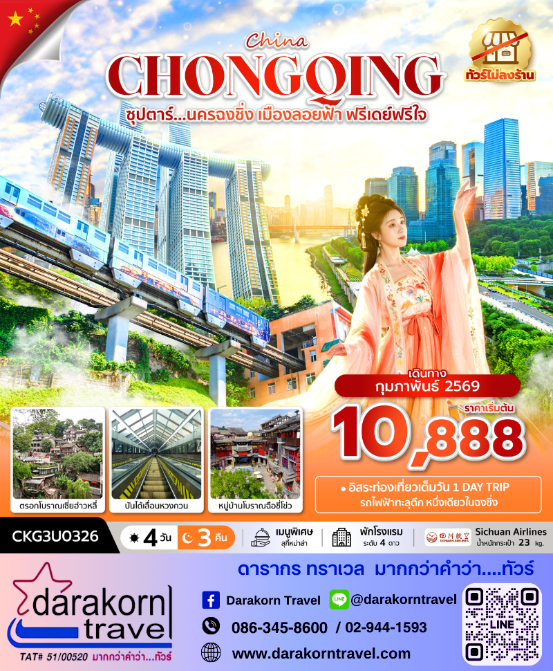 | DAY1 | สนามบินนานาชาติสุวรรณภูมิ (กรุงเทพฯ) 3U3772 (BKK – CKG 19.20 น.-23.50 น.)สนามบินนานาชาติฉงชิ่งเจียงเป่ย |