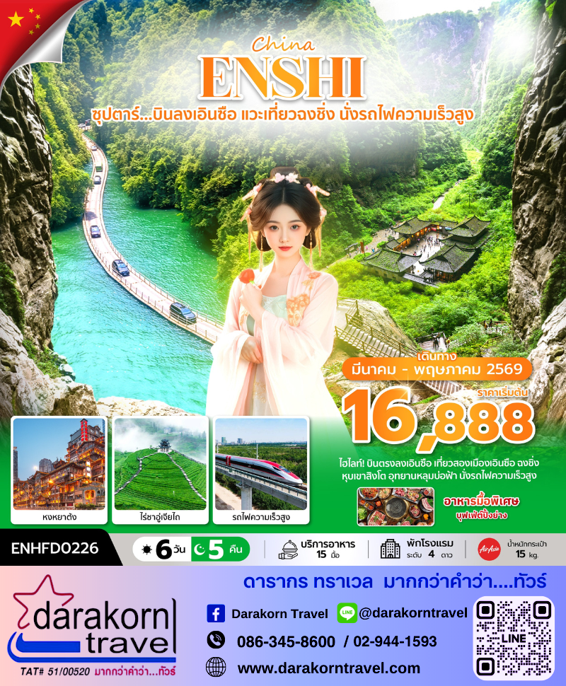 | DAY5 | ศูนย์สมุนไพรจีน – ศูนย์ผลิตภัณฑ์หยก – นั่งรถไฟความเร็วสูงกลับสู่เมืองเอินซือ – ถนนคนเดินเมืองลูกสาวเอินซือ – Option เสริม! การแสดงซีลานกาพู่ การแสดงศิลปะพื้นเมืองของเผ่าถู่เจีย |