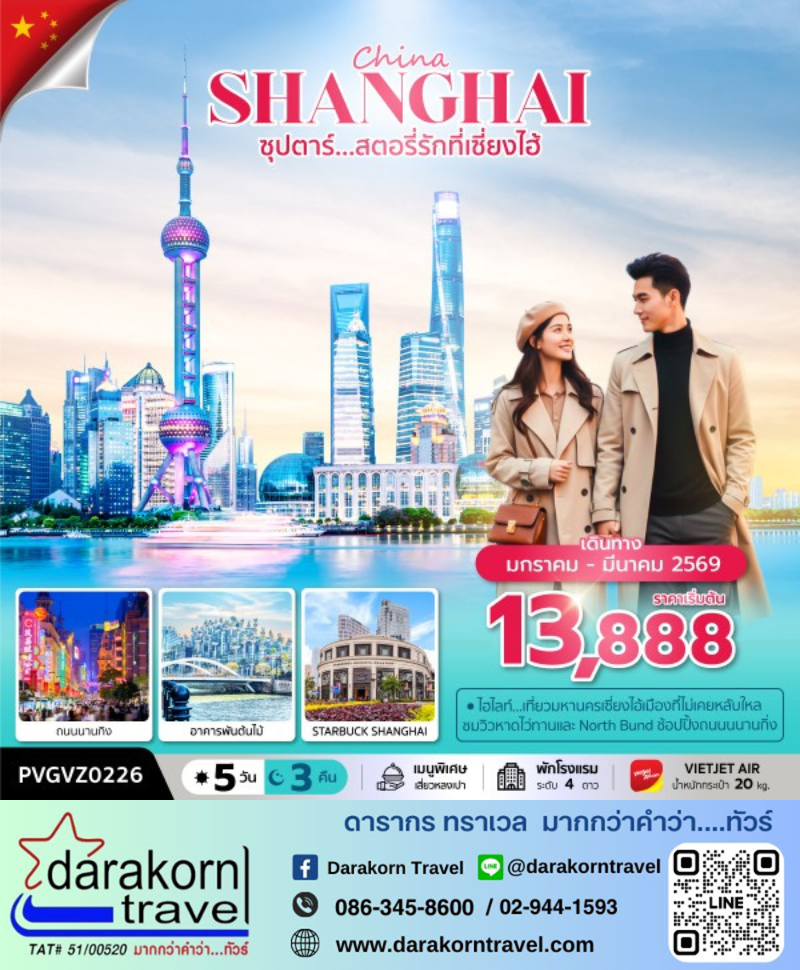 | DAY1 | สนามบินสุวรรณภูมิ – สนามบินเซี่ยงไฮ้ผู่ตง – เมืองเซี่ยงไฮ |