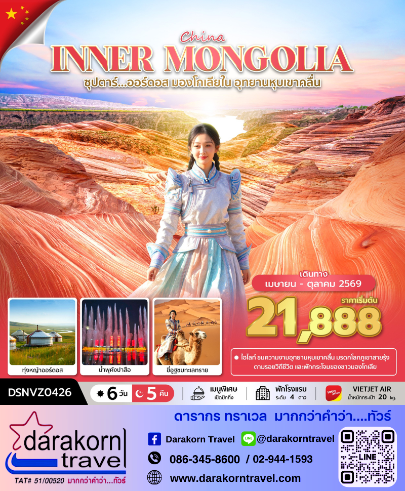 ทัวร์จีน - ซุปตาร์...ออร์ดอส มองโกเลียใน อุทยานหุบเขาคลื่น 6วัน5คืน(VZ)เดือนเมษายน - ตุลาคม 2569