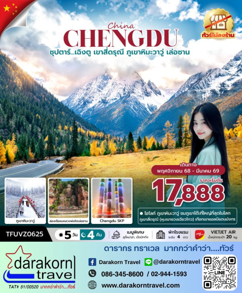 ทัวร์จีน - ซุปตาร์...เฉิงตู เขาสี่ดรุณี ภูเขาหิมะวาวู่ เล่อซาน (ไม่ลงร้าน) 5วัน4คืน(VZ)เดือนพฤศจิกายน 2568 - มีนาคม 2569