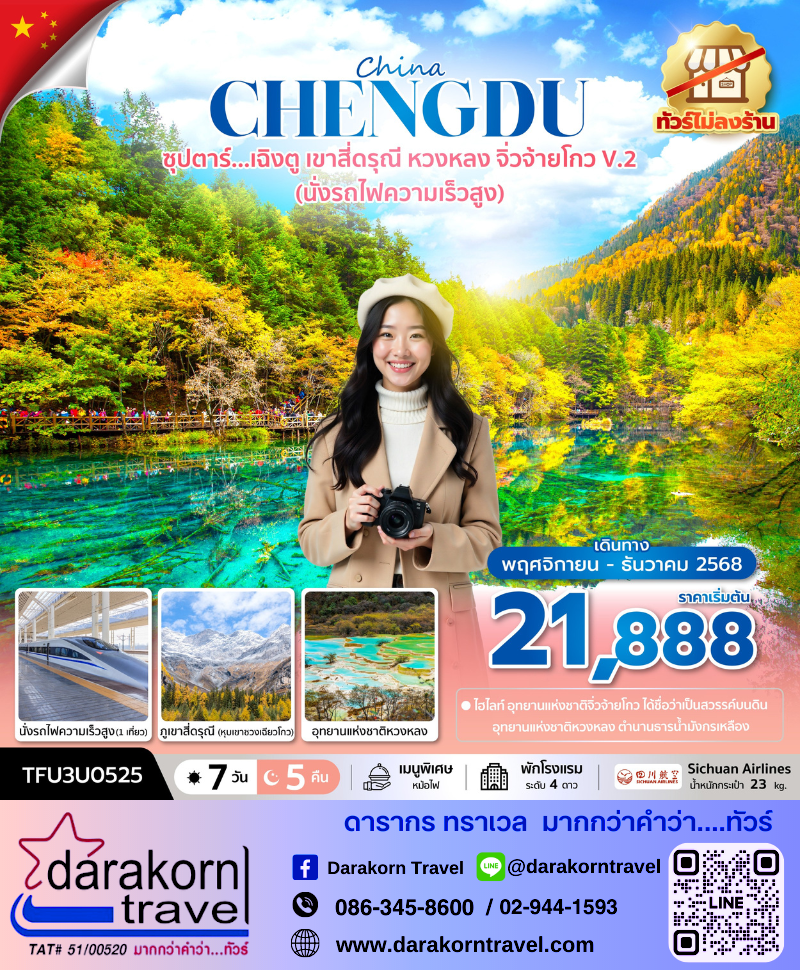 | DAY6 | เขตอุทยานแห่งชาติจิ่วจ้ายโกว – สถานีรถไฟความเร็วสูงซงพาน / หวงหลงจิ่วจ้าย – นั่งรถไฟความเร็วสูงกลับสู่เมืองเฉิงตู – ถนนคนเดินชุนซีลู่ – แพนด้ายักษ์ปีนตึก IFS – ร้าน POP MART – ถนนคนเดินไท่กู่หลี่ – OPTION TOUR : โชว์เปลี่ยนหน้ากากที่นั่ง VIP |