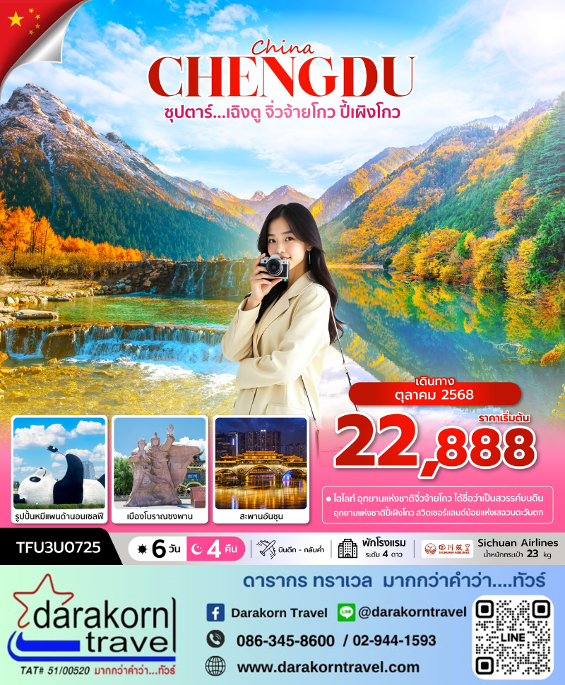 DAY2 | กรุงเทพฯ – ท่าอากาศยานนานาชาติเฉิงตูเทียนฟู่ (เมืองเฉิงตู) – ทะเลสาบเต๋อซี – เมืองโบราณซงพาน – เมืองจิ่วจ้ายโกว |