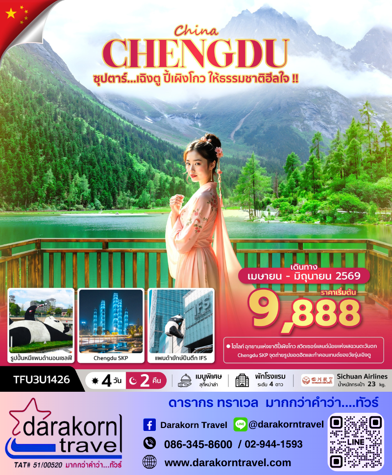 | DAY4 | เมืองเฉิงตู – ร้านผ้าไหม – ร้านยาสมุนไพรจีน – ร้านหยก – ถนนคนเดินชุนซีลู่ – แพนด้ายักษ์ปีนตึก IFS – ถนนคนเดินไท่กู่หลี่ – ท่าอากาศยานนานาชาติเฉิงตูเทียนฟู่ (เมืองเฉิงตู) – ท่าอากาศยานนานาชาติสุวรรณภูมิ |