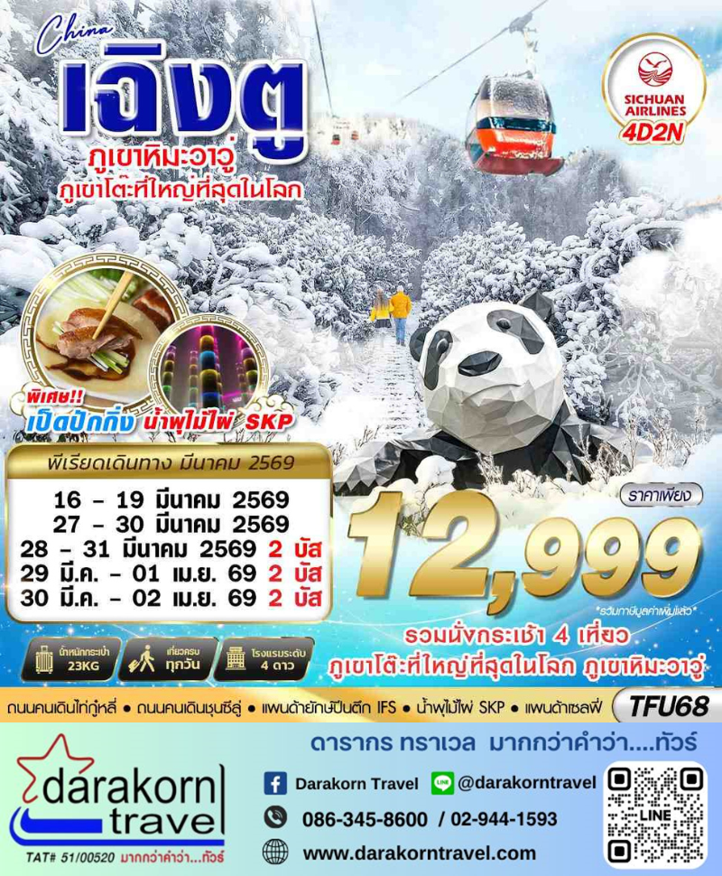 | DAY2 | ท่าอากาศยานเฉิงตูเทียนฟู่ – เดินทางไปภูเขาหิมะวาวู่ – ขึ้นกระเช้าชมภูเขาโต๊ะที่ใหญ่ที่สุดในโลก (รวมกระเช้า 4 เที่ยว) |