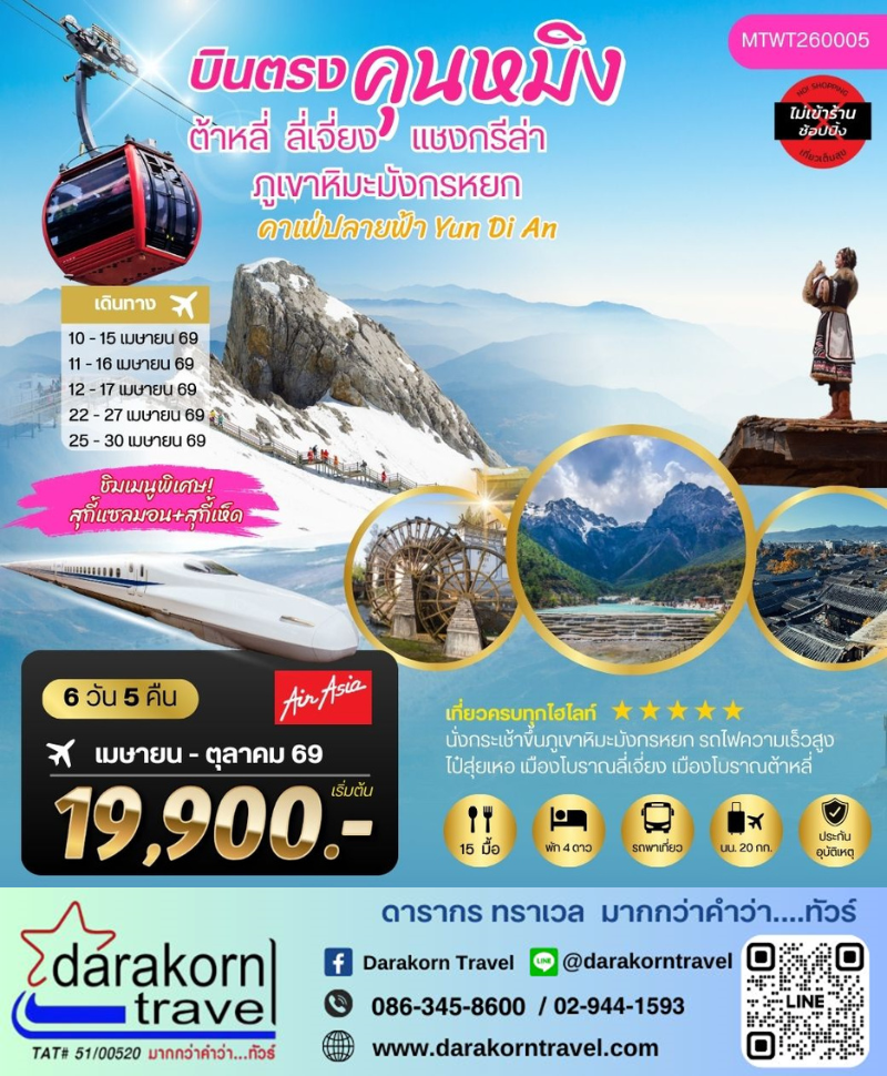 | DAY1 | สนามบินดอนเมือง-คุนหมิง -เดินทางโดยรถไฟความเร็วสู่เมืองต้าลี่ |