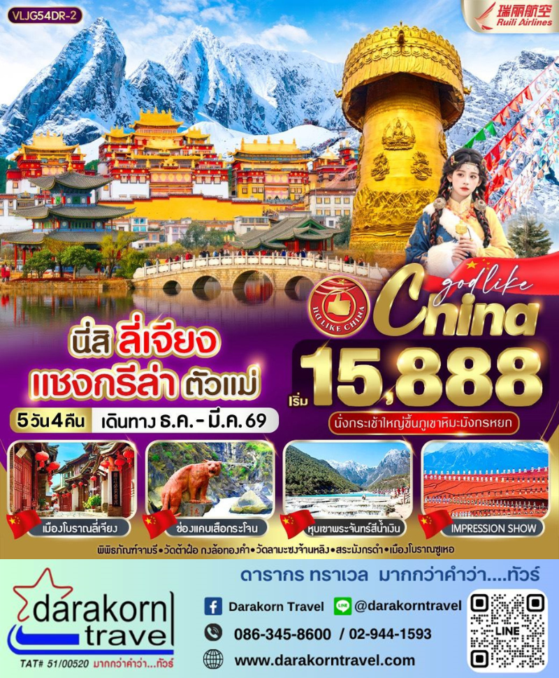| DAY2 | ช่องเขาเสือกระโจน (ไม่รวมบันไดเลื่อน) – เมืองแชงกรีล่า – พิพิธภัณฑ์จามรี – วัดต้าฝ๋อ กงล้อทองคำ- เมืองโบราณตู่เค่อจง |