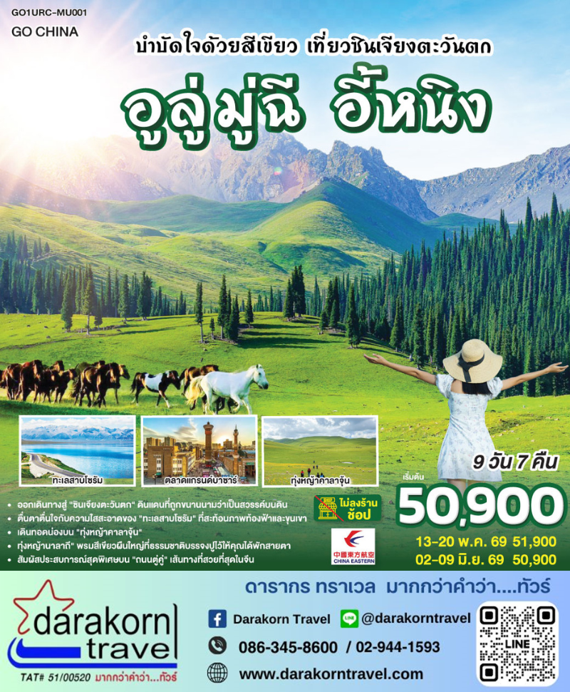 | DAY2 | กรุงเทพฯ(สนามบินสุวรรณภูมิ) – นานกิง (สนามบินหนานจิงหลูโข่ว) (MU2804 : 02.10-07.10) – อูลู่มู่ฉี (สนามบินอูลูมู่ฉีเทียนซาน) (MU2959 : 10.45-15.55) |