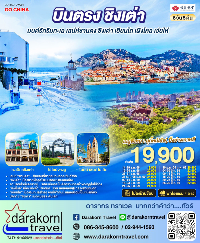 | DAY1 | กรุงเทพฯ (สนามบินสุวรรณภูมิ) – ชิงเต่า (ท่าอากาศยานชิงเต่าเจียวตง) (QW9898 : 16:00 – 21:35) |