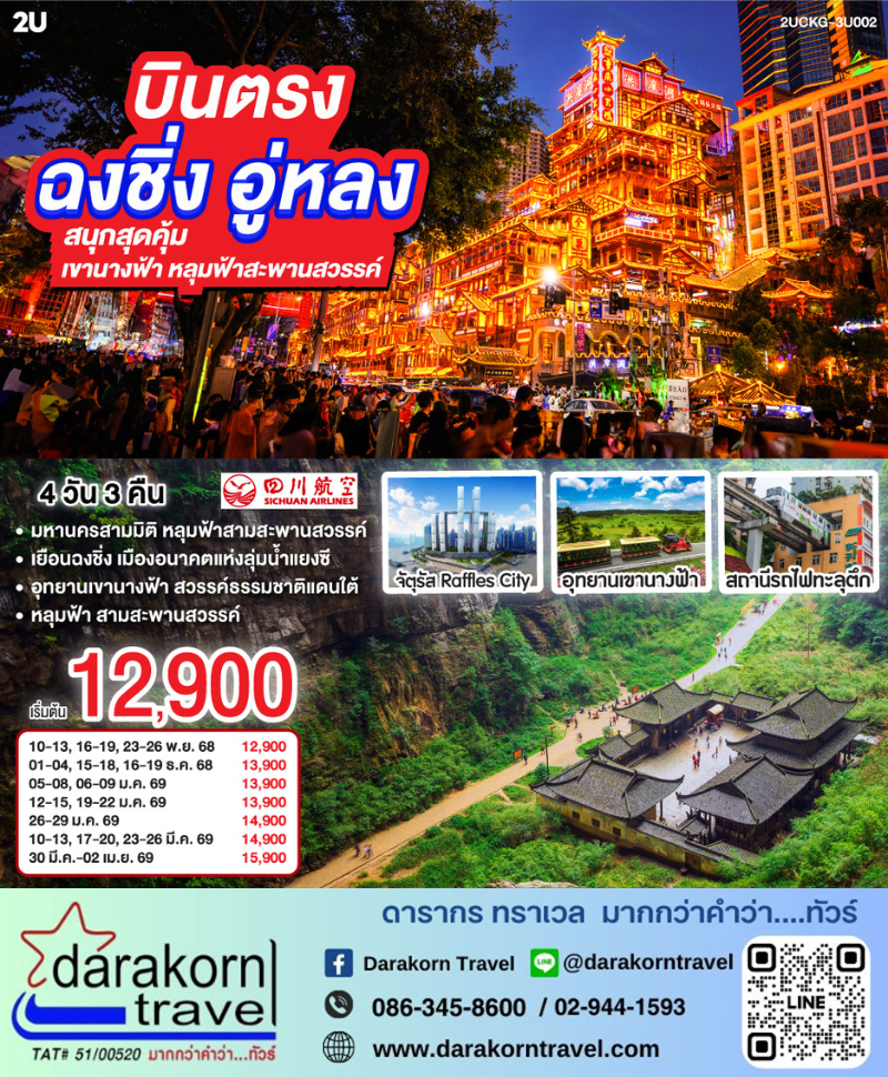 | DAY1 | กรุงเทพฯ (สุวรรณภูมิ) – ฉงชิ่ง (สนามบินฉงชิ่งเจียงเป่ย) (3U3772: 19.20-23.50) |