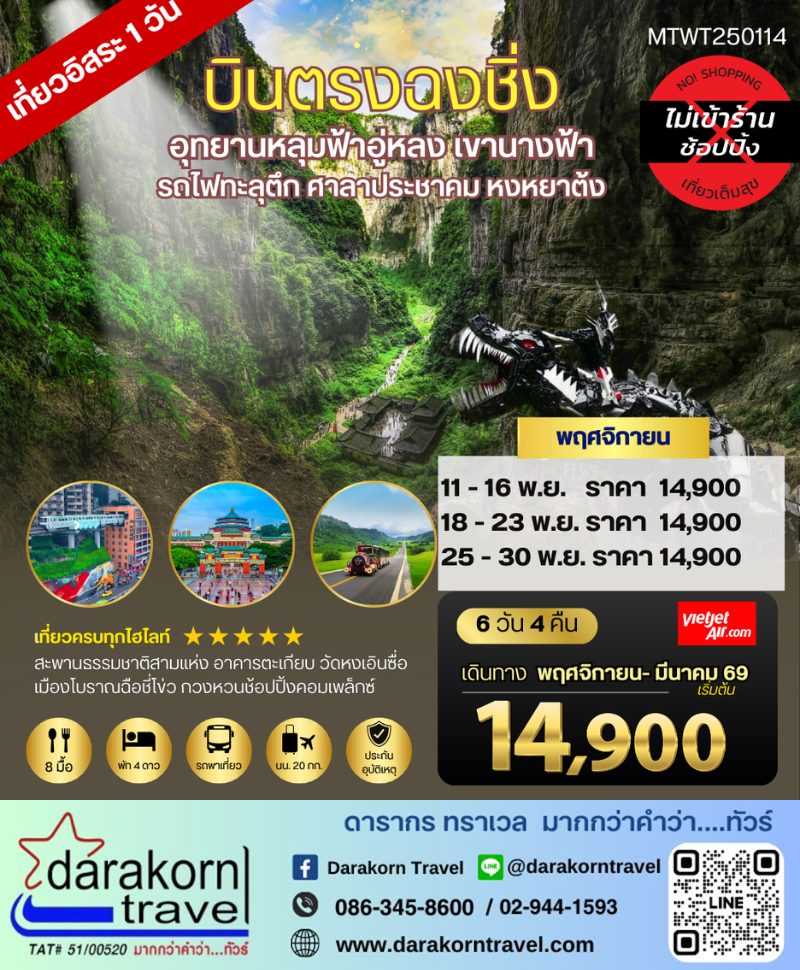 DAY3 | อุทยานเขานางฟ้า-นครฉงชิ่ง-ห้างกวงหวนช้อปปิ้งเซ้นเตอร์-อาคารตะเกียบ-ย่านหงหยาต้ง – ไกด์นำเสนอรายการเสริม ล่องเรือชมแสงสียามค่ำในแม่น้ำฉงชิ่ง |