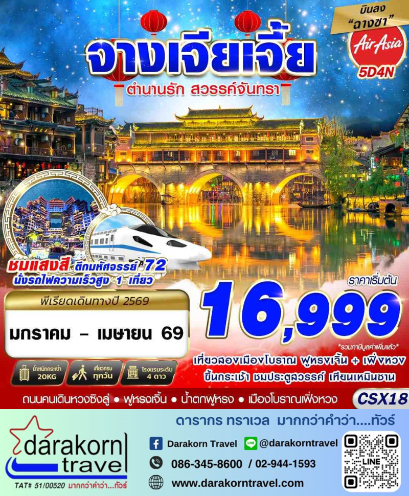 | DAY1 | กรุงเทพฯ(ดอนเมือง) – ท่าอากาศยานหวงฮัวฉางซา – เดินทางไปเฟิ่งหวง – เมืองโบราณเฟิ่งหวง – ล่องเรือแม่น้ำถัวเจียง – ชมเมืองโบราณยามค่ำคืน |