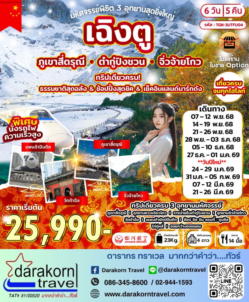 DAY2 | เฉิงตู • ภูเขาสี่ดรุณี • อุทยานซวงเฉียวโกว (รวมรถอุทยาน) • เม่าเสี้ยน |