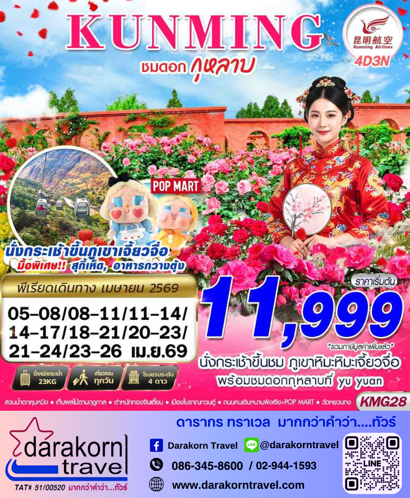 | DAY4 | ชมดอกไม้ตามฤดูกาล – วัดหยวนทง – ร้านหยก – ท่าอากาศยานคุนหมิงฉางซุย – กรุงเทพฯ(สุวรรณภูมิ) |