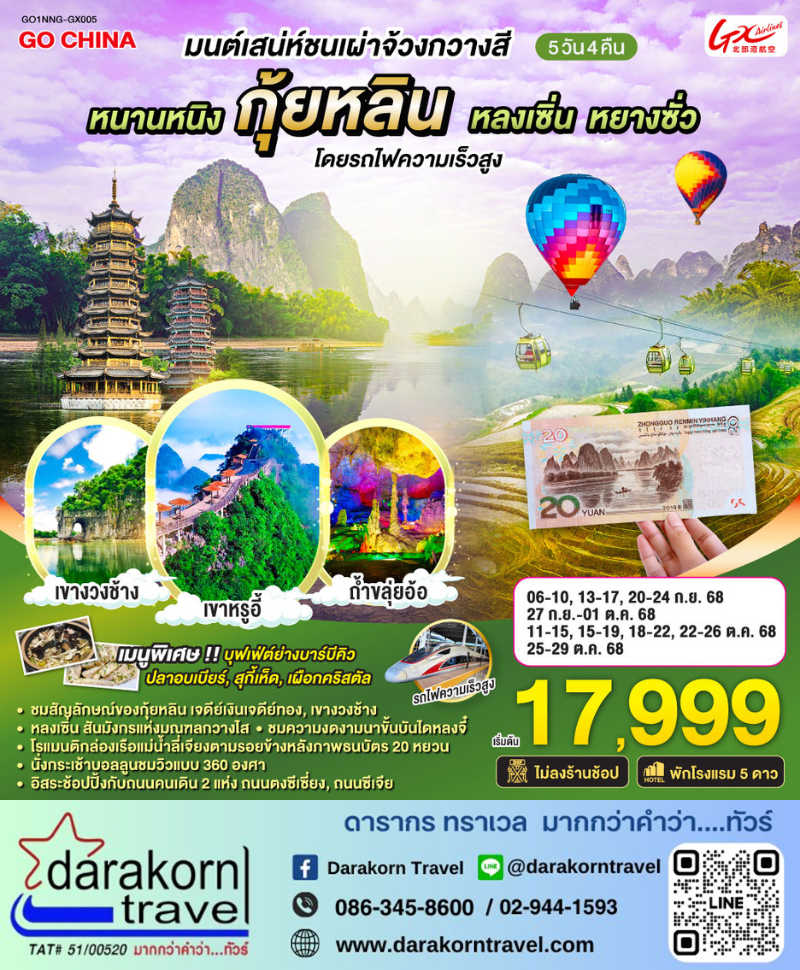 DAY1 | กรุงเทพฯ (สนามบินสุวรรณภูมิ) – (ท่าอากาศยานนานาชาติหนานนิง วูซู่) (GX8910: 10:50 – 13:50) หนานหนิง-นั่งรถไฟความเร็วสู่กุ้ยหลิน-ชมแสงสียามราตรีเขางวงช้าง-เจดีย์เงินเจดีย์ทอง |