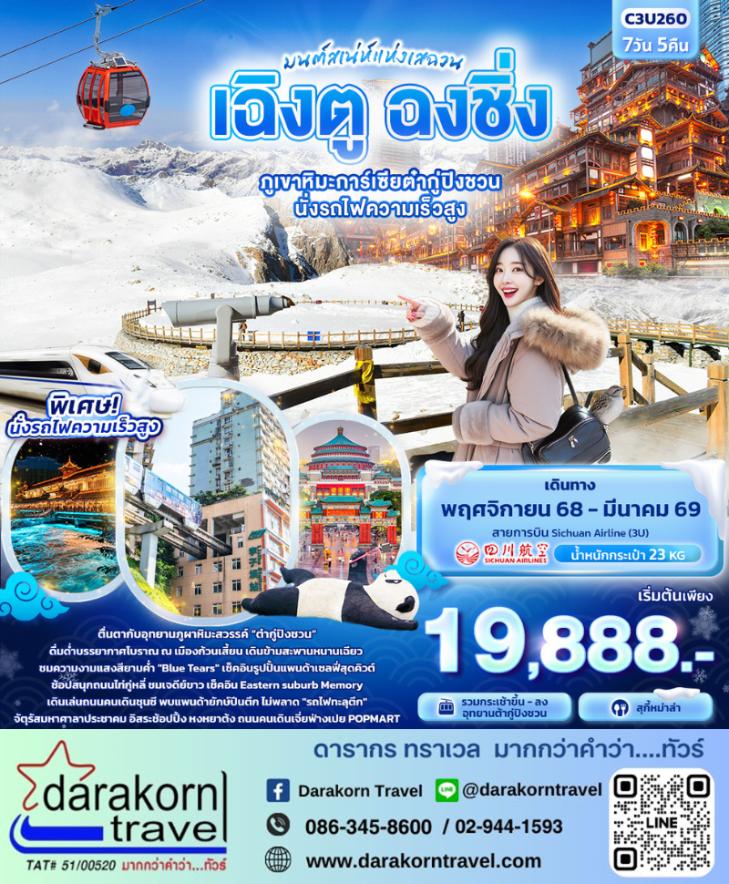 ทัวร์จีน – มนต์เสน่ห์แห่งเสฉวน…เฉิงตู ฉงชิ่ง ภูเขาหิมะการ์เซียต๋ากู่ปิงชวน นั่งรถไฟความเร็วสูง 7วัน5คืน(3U)เดือนพฤศจิกายน 2568 – มีนาคม 2569 |