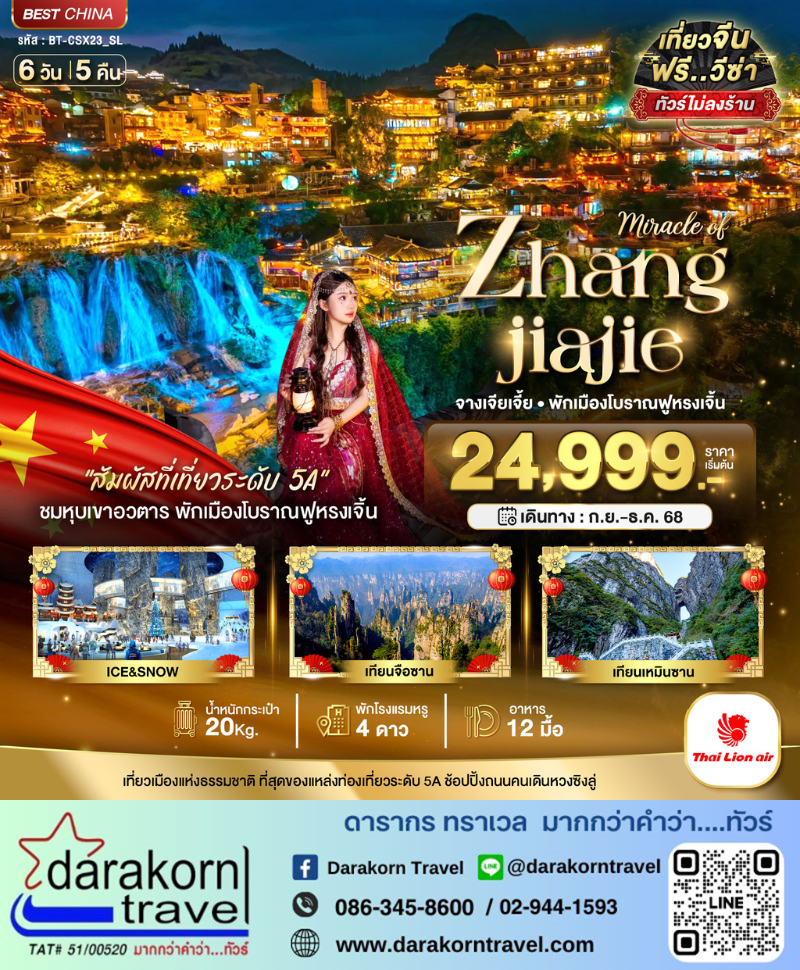ทัวร์จีน - มหัศจรรย์...จางเจียเจี้ย พักเมืองโบราณฟูหรงเจิ้น 6วัน5คืนเดือนกันยายน - ธันวาคม 2568