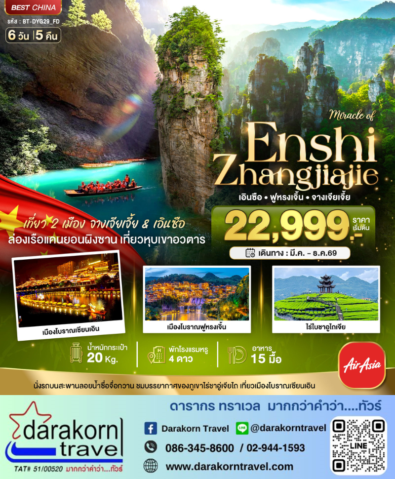 | DAY2 | เมืองเอินซือ • อุทยานซื่อจือกวน • หุบเขาสิงโต • สะพานลอยน้ำ (รวมรถแบตเตอรี่) • ภูเขาใบชาอู่ไถเจีย • เมืองโบราณเซียนเอิน • OPTION: ล่องเรือมังกร |