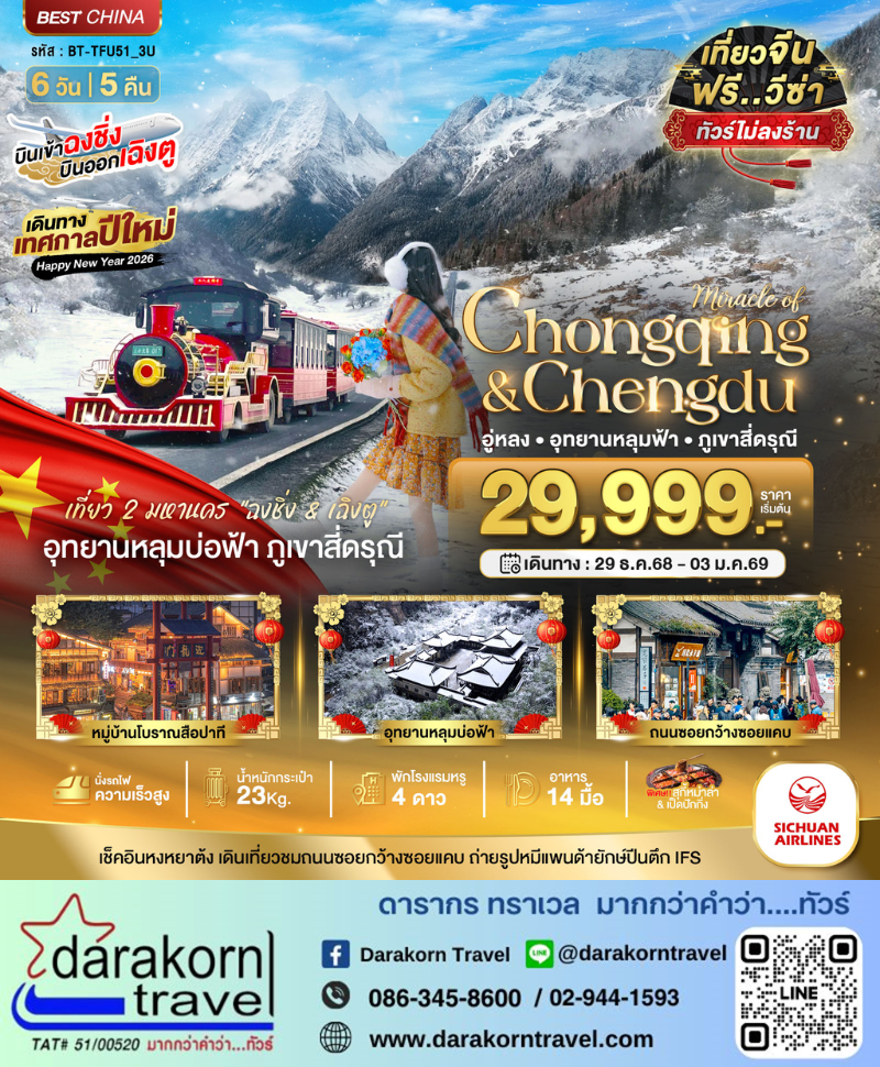 DAY4 | สถานีรถไฟความเร็วสูง •มหานครเฉิงตู •ถนนโบราณสามก๊กจินหลี่ •ถนนไท่กู๋หลี •ถนนคนเดินชุนซี่ลู่ •หมีแพนด้ายักษ์ปีนตึก IFS•เมืองตูเจียงเอี้ยน •สะพานหนานเฉียว •น้าตาสีฟ้า (BLUE TEAR) |