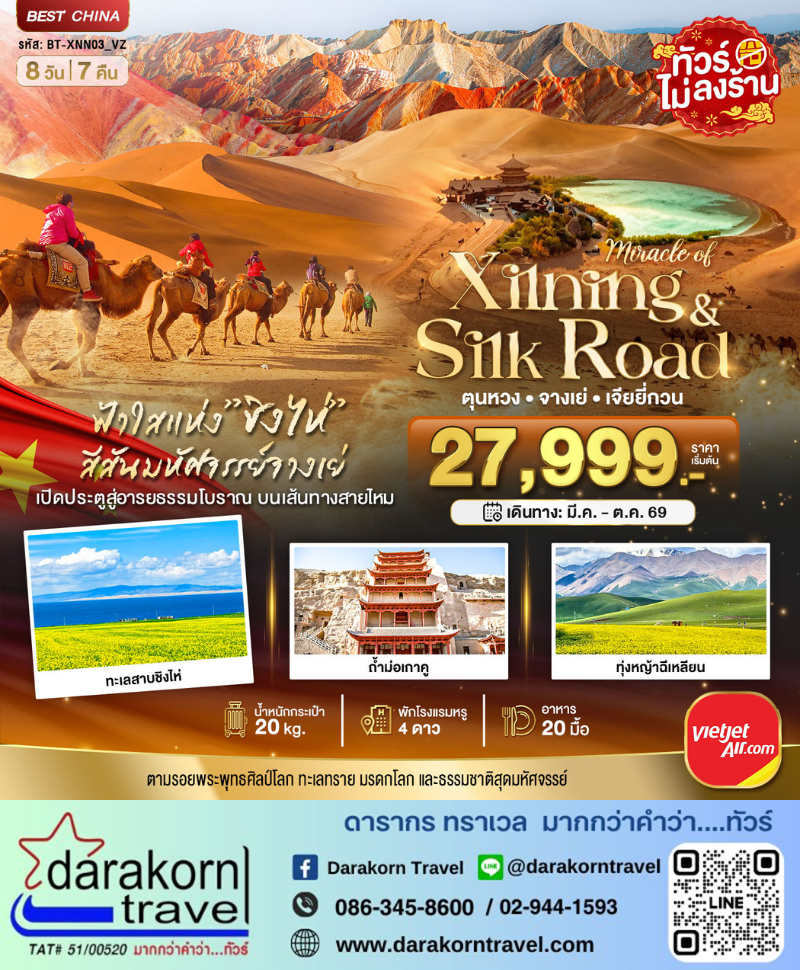| DAY8 | ซีหนิง – วัดถ่าเอ๋อร์ – ถนนคนเดินเซี่ยหนานกวน -ซีหนิง (สนามบินเฉาเจียเป่า) กรุงเทพฯ(สนามบินสุวรรณภูมิ) (VZ3691 : 23.40-02.45+1) |