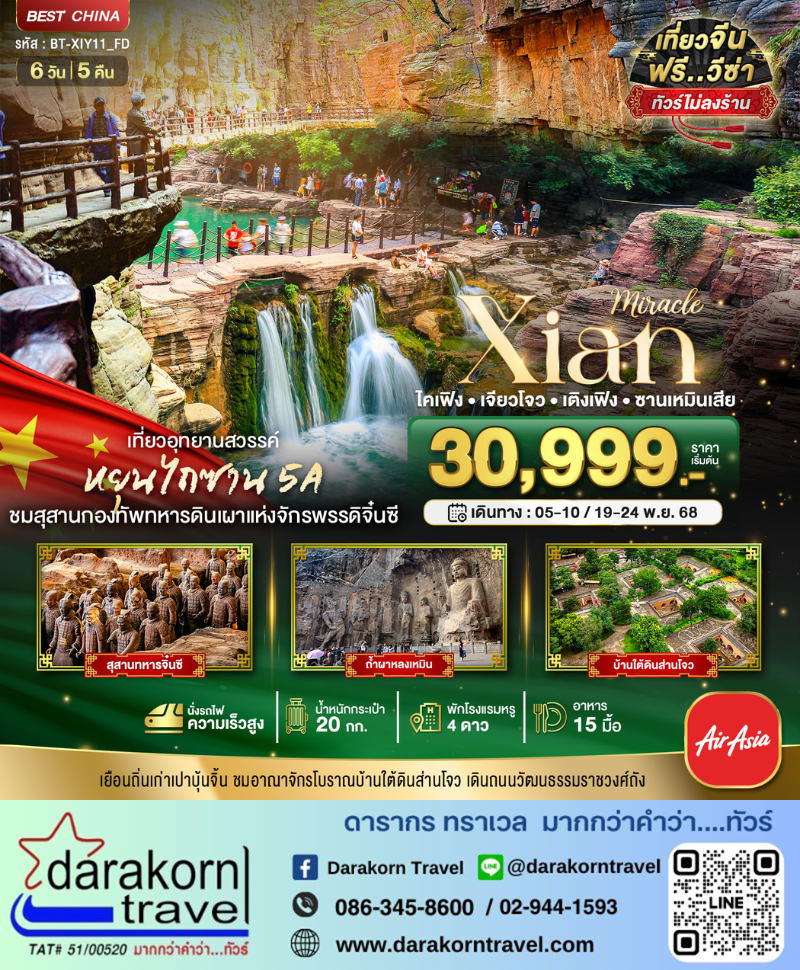 ทัวร์จีน - มหัศจรรย์...ซีอาน ไคเฟิง เจียวโจว เติงเฟิง ซานเหมินเสีย 6วัน5คืน(FD)เดือนพฤศจิกายน 2568