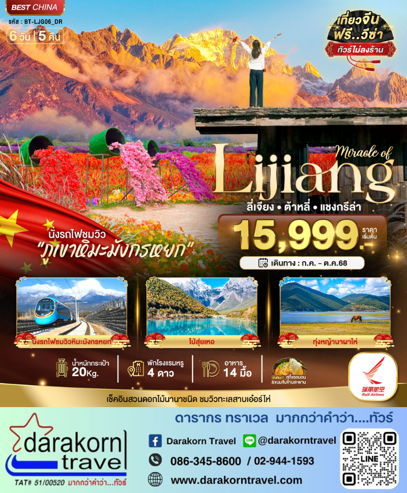 ทัวร์จีน - มหัศจรรย์...ลี่เจียง ต้าหลี่ แชงกรีล่า นั่งรถไฟชมวิวภูเขาหิมะมังกรหยก(ไม่ลงร้าน) 6วัน5คืน(DR)เดือนกรกฎาคม - ตุลาคม 2568