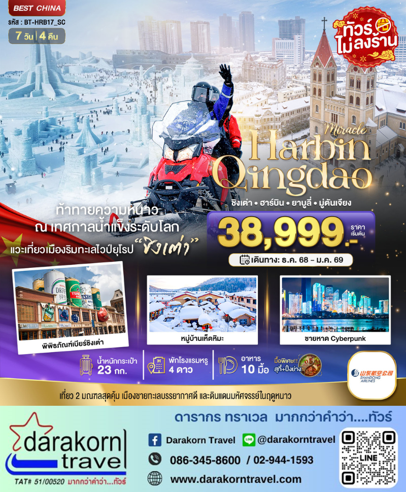 ทัวร์จีน - มหัศจรรย์...ฮาร์บิน ชิงเต่า ยาบูลี่ มู่ตันเจียง หมู่บ้านหิมะ 7วัน4คืน(SC)เดือนธันวาคม 2568 - มกราคม 2569
