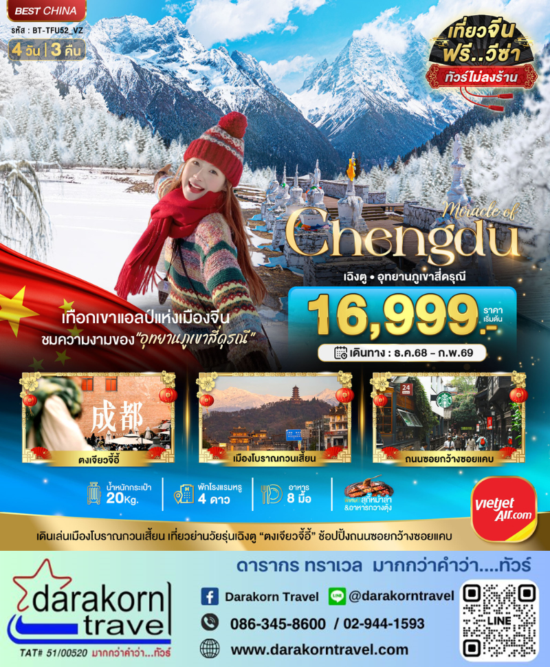 DAY3 | จัตุรัสหย่างเทียนวู •หมีแพนด้าเซลฟี่ •เมืองโบราณกวนเสี้ยน •เลือกซื้อ OPTION ศูนย์อนุรักษ์หมีแพนด้า(รวมรถแบตเตอรี่)•เมืองเฉิงตู •ถนนคนเดินซอยกว้างซอยแคบ |