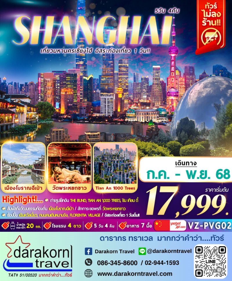 DAY1 | สนามบินนานาชาติสุวรรณภูมิ (กรุงเทพฯ) VZ3524 (BKK– PVG 16.45 – 22.00) – สนามบินนานาชาติเซี่ยงไฮ้ – เข้าโรงแรมที่พัก |