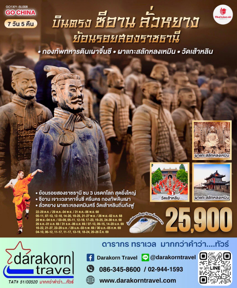 ทัวร์จีน – ย้อนรอยสองราชธานี กองทัพทหารดินเผาจิ๋นซี ผาแกะสลักหลงเหมิน วัดเส้าหลิน 7วัน5คืน(SL)เดือนตุลาคม 2568 – มีนาคม 2569 |
