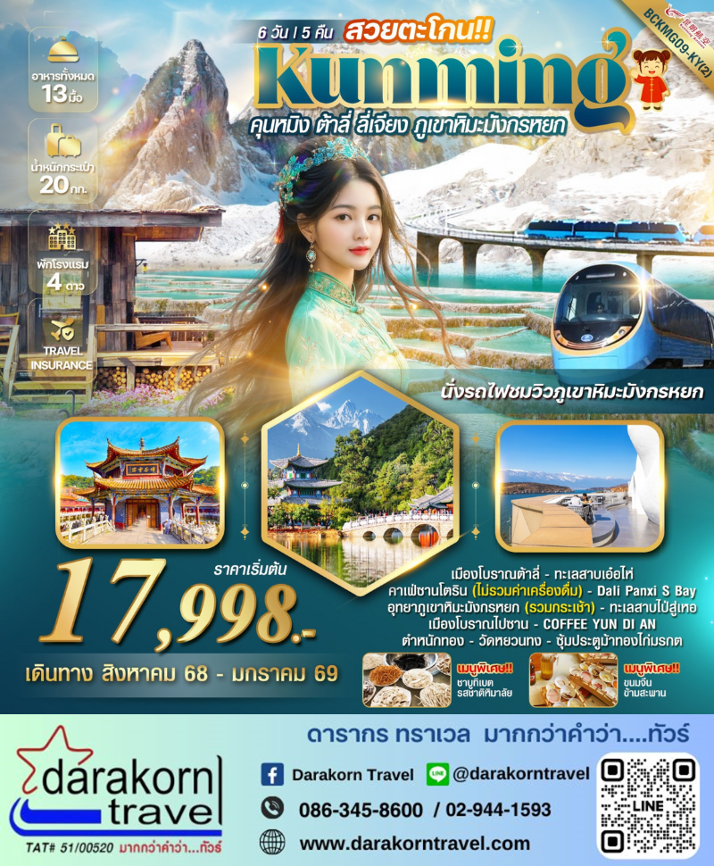 DAY1 | กรุงเทพฯสุวรรณภูมิ – สนามบินคุนหมิงฉางชุ่ย KY8370 (20:00-23.20) – คุนหมิง |