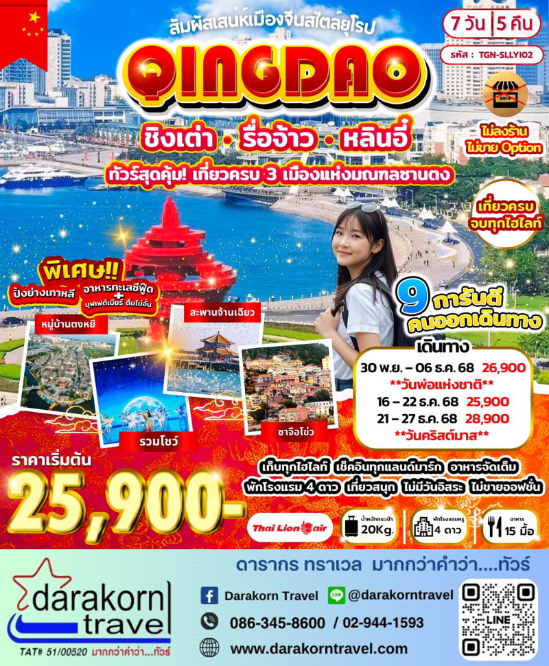 ทัวร์จีน - สัมผัสเสน่หเมืองจีนสไตล์ยุโรป ชิงเต่า รื่อจ้าว หลินอี๋ 7วัน5คืน(SL)เดือนพฤศจิกายน - ธันวาคม 2568