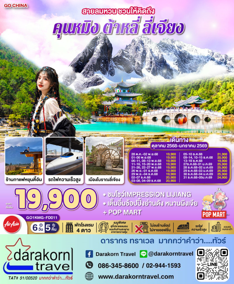 DAY1 | กรุงเทพฯ (สนามบินดอนเมือง) – คุนหมิง (ท่าอากาศยานนานาชาติคุนหมิงฉางสุ่ย) (FD582 : 08:00 – 11:25) – ต้าหลี่ |