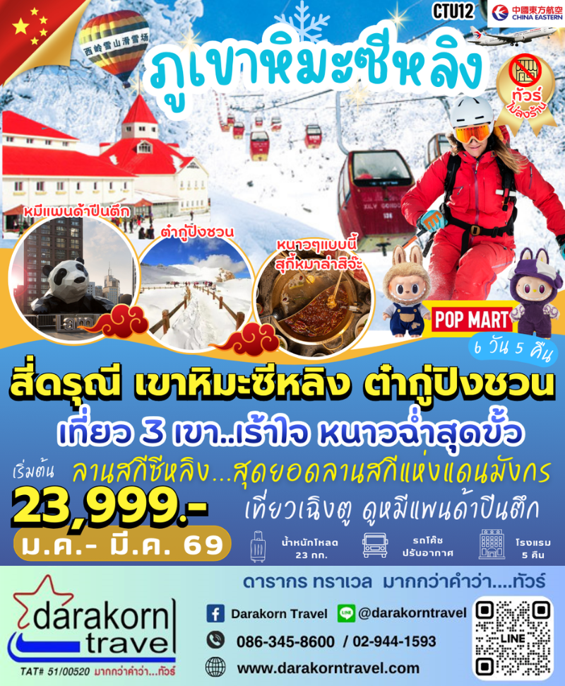 | DAY2 | เฉิงตู –ภูเขาหิมะซีหลิง (*ไม่รวมอุปกรณ์เล่นสกี) –ชมวิวยอดเขาสุริยันจันทรา RI YUE PING –ตูเจียงเอี้ยน |