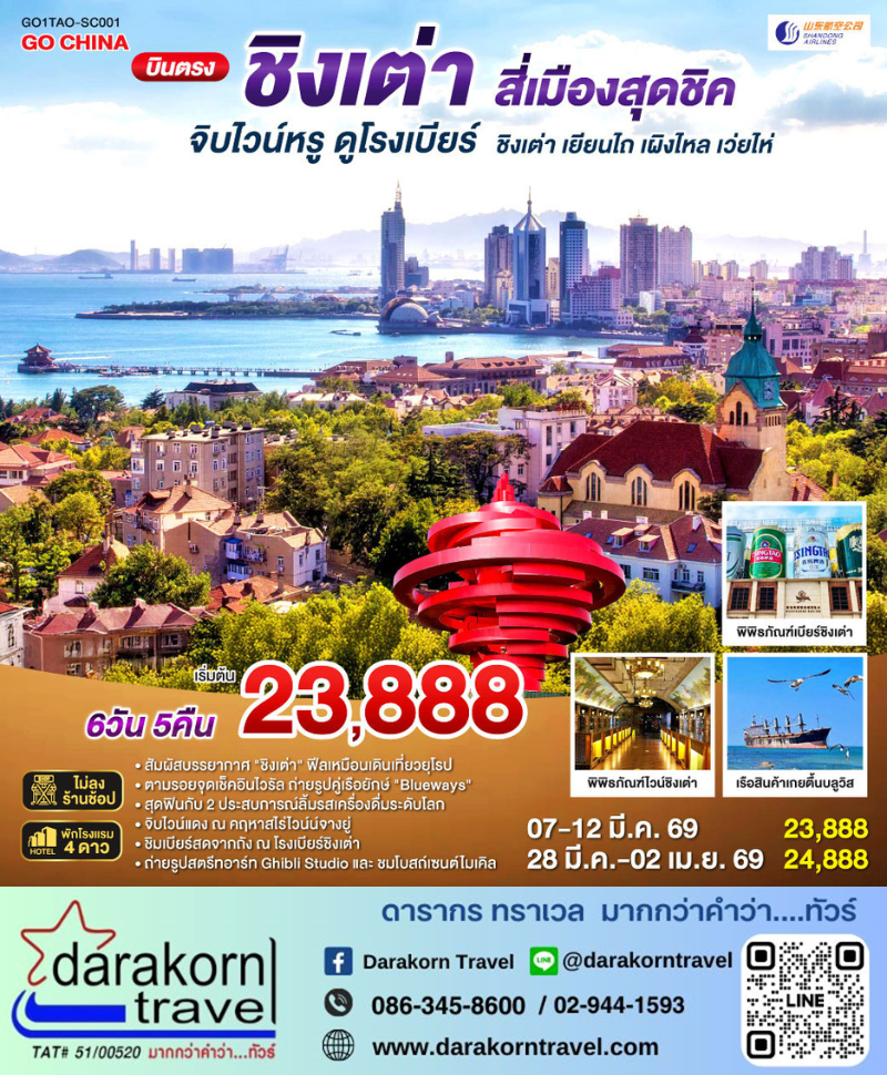 | DAY6 | ย่านปาต้ากวน – เขาซิ่นฮ่าวซาน – เช็คอินจัตุรัส 54 – ชิงเต่า (ท่าอากาศยานชิงเต่าเจียวตง) – กรุงเทพฯ (สนามบินสุวรรณภูมิ) |