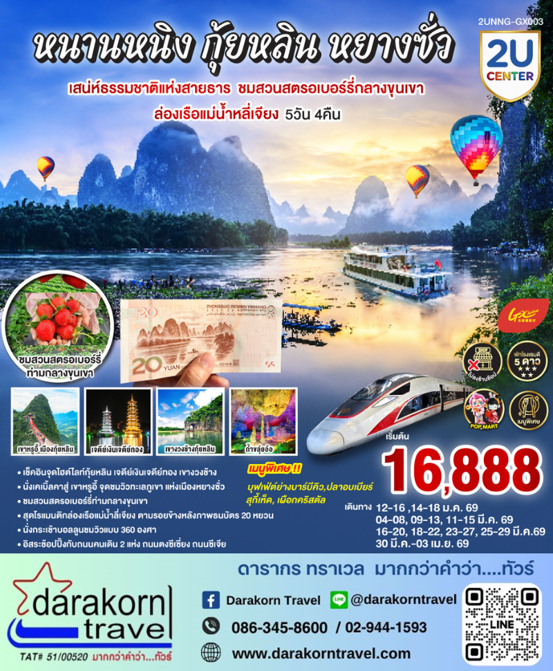 | DAY1 | กรุงเทพฯ (สนามบินสุวรรณภูมิ) – (ท่าอากาศยานนานาชาติหนานนิง วูซู่) (GX8910: 10:50 – 13:50) หนานหนิง-นั่งรถไฟความเร็วสู่กุ้ยหลิน |