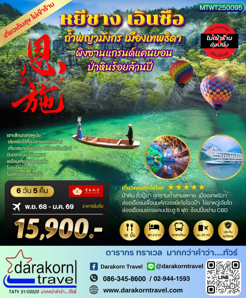 ทัวร์จีน - หยีชัง เอินซือ ถ้ำพญามังกร เมืองเทพธิดา ป่าหินร้อยล้านปี 6วัน5คืน(QW)เดือนตุลาคม 2568 - มกราคม 2569