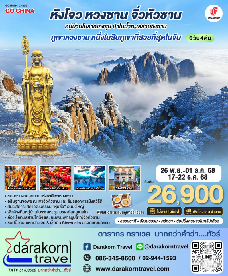| DAY2 | กรุงเทพฯ (CA716 : 03.20 – 07.55) – หังโจว (สนามบินหังโจวเสี่ยวซาน) – ทะเลสาบซีหู – Starbucks Reserve – เมืองหวงซาน – ชมการแสดงหวงซาน |