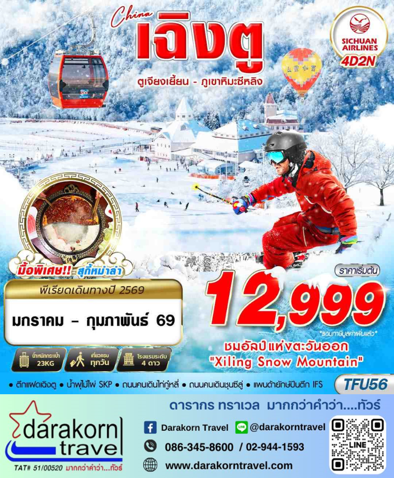 | DAY2 | อากาศยานเฉิงตูเทียนฟู่ – นั่งรถบัสสู่ภูเขาหิมะซีหลิง – ภูเขาหิมะซีหลิง (รวมค่ากระเช้า 2 เที่ยว // ไม่รวมค่ากิจกรรม) – เข้าพักเมืองตูเจียงเยี้ยน |