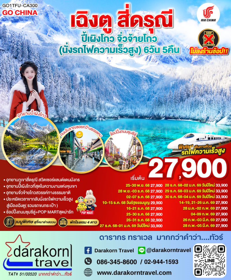 ทัวร์จีน - เฉิงตู สี่ดรุณี ปี้เผิงโกว จิ่วจ้ายโกว (นั่งรถไฟความเร็วสูง) 6วัน5คืน(CA)เดือนพฤศจิกายน 2568 - กุมภาพันธ์ 2569
